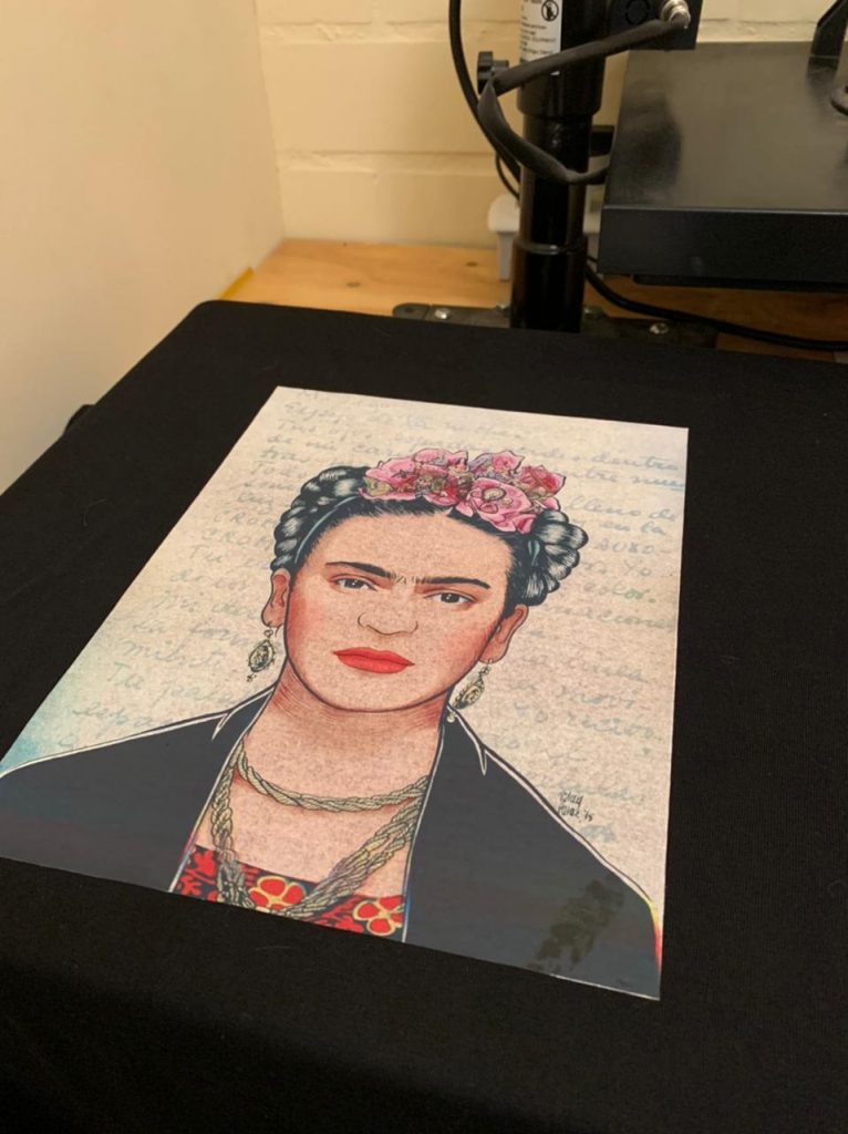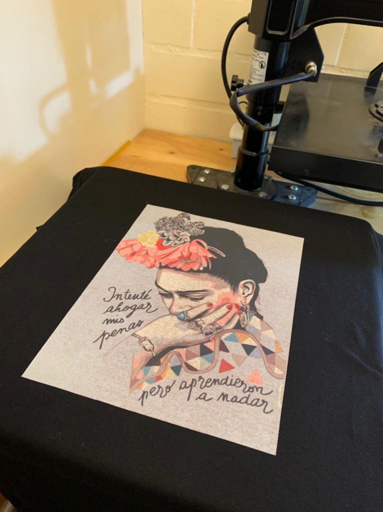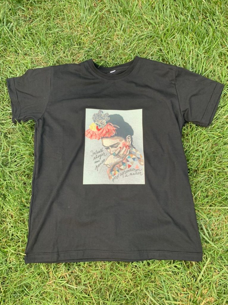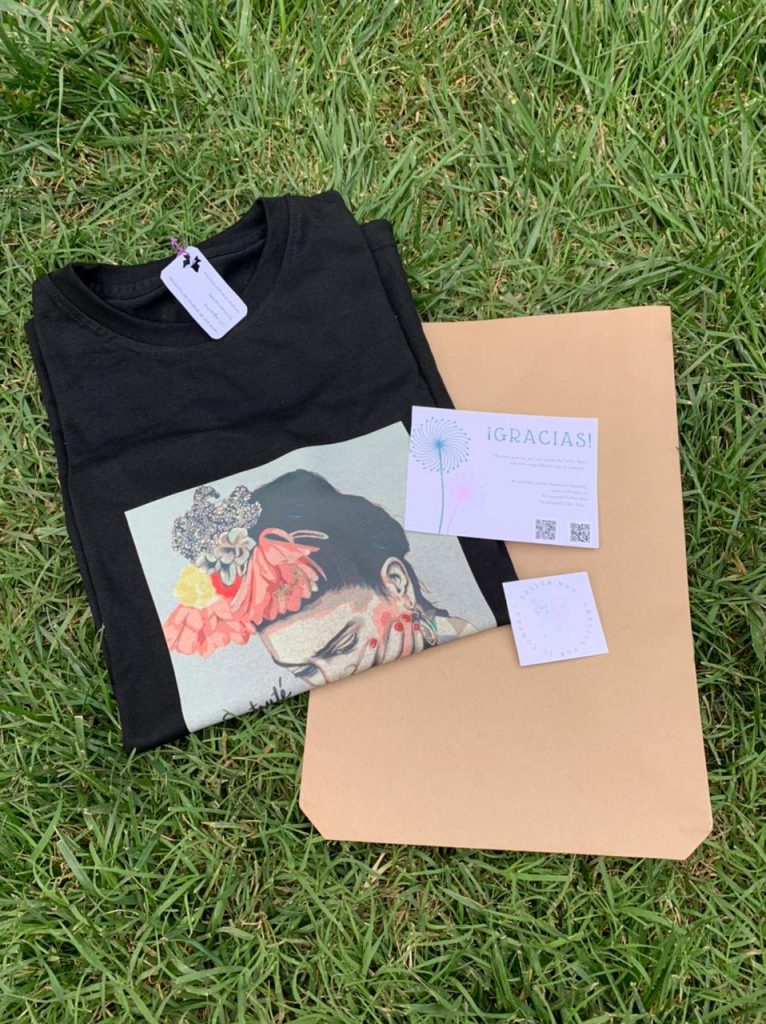 En esta oportunidad tenemos el pedido de dos poleras de algodón de color negras, una de talla M y la otra de talla L, ambas poleras fueron estampadas con diseños diferentes de Frida Kahlo en tamaño carta.